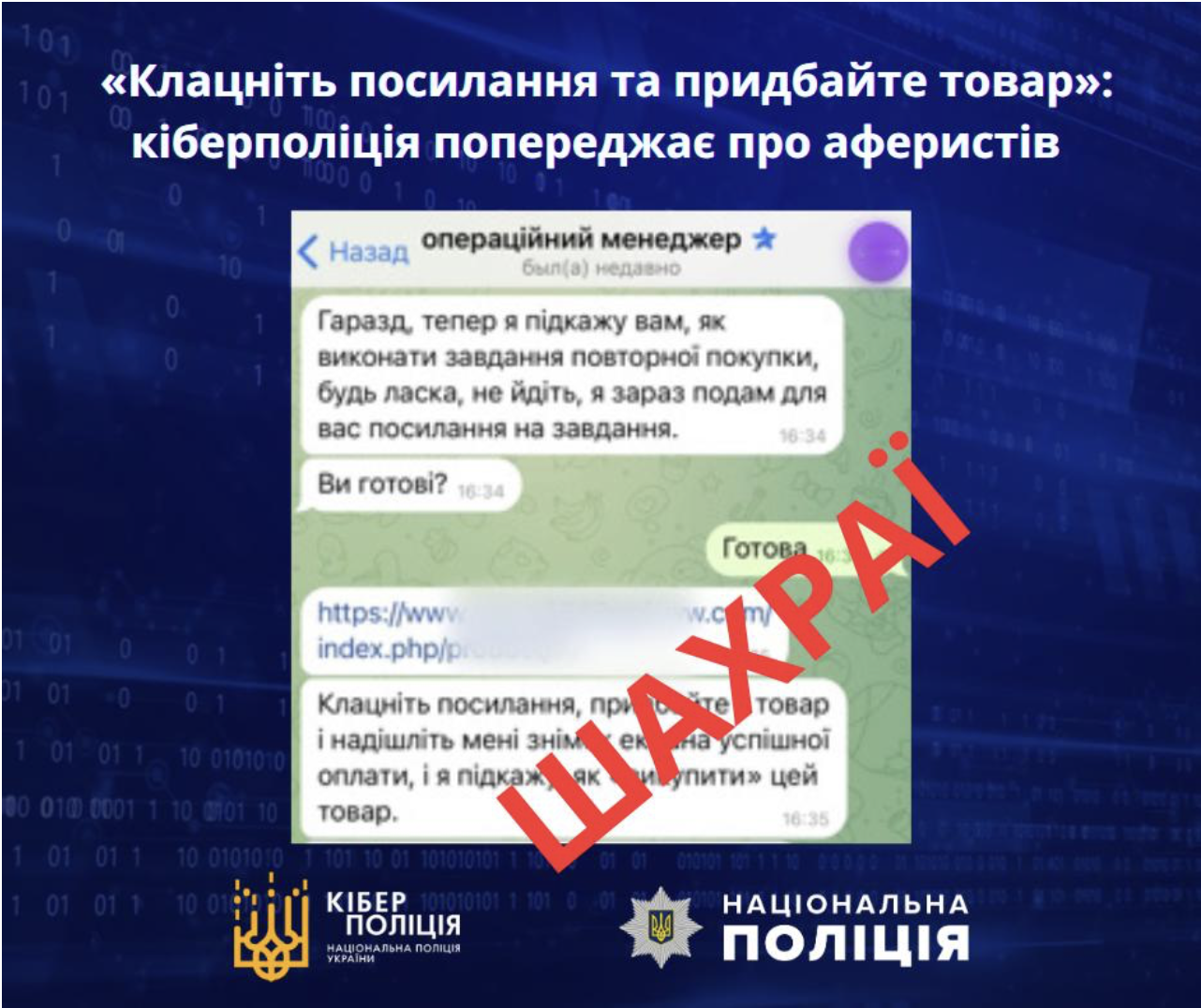 Зловмисники надсилають у популярних месенджерах повідомлення з пропозиціями легкого заробітку. Схема полягає в нібито популяризації товарів на відомому маркетплейсі шляхом їх купівлі та подальшого продажу на вже підконтрольному аферистам сайті.