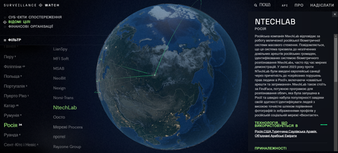 Сайт надає інструменти для виявлення та аналізу різних компаній, які займаються розробкою, постачанням та впровадженням технологій спостереження в різних країнах, так і в росії.